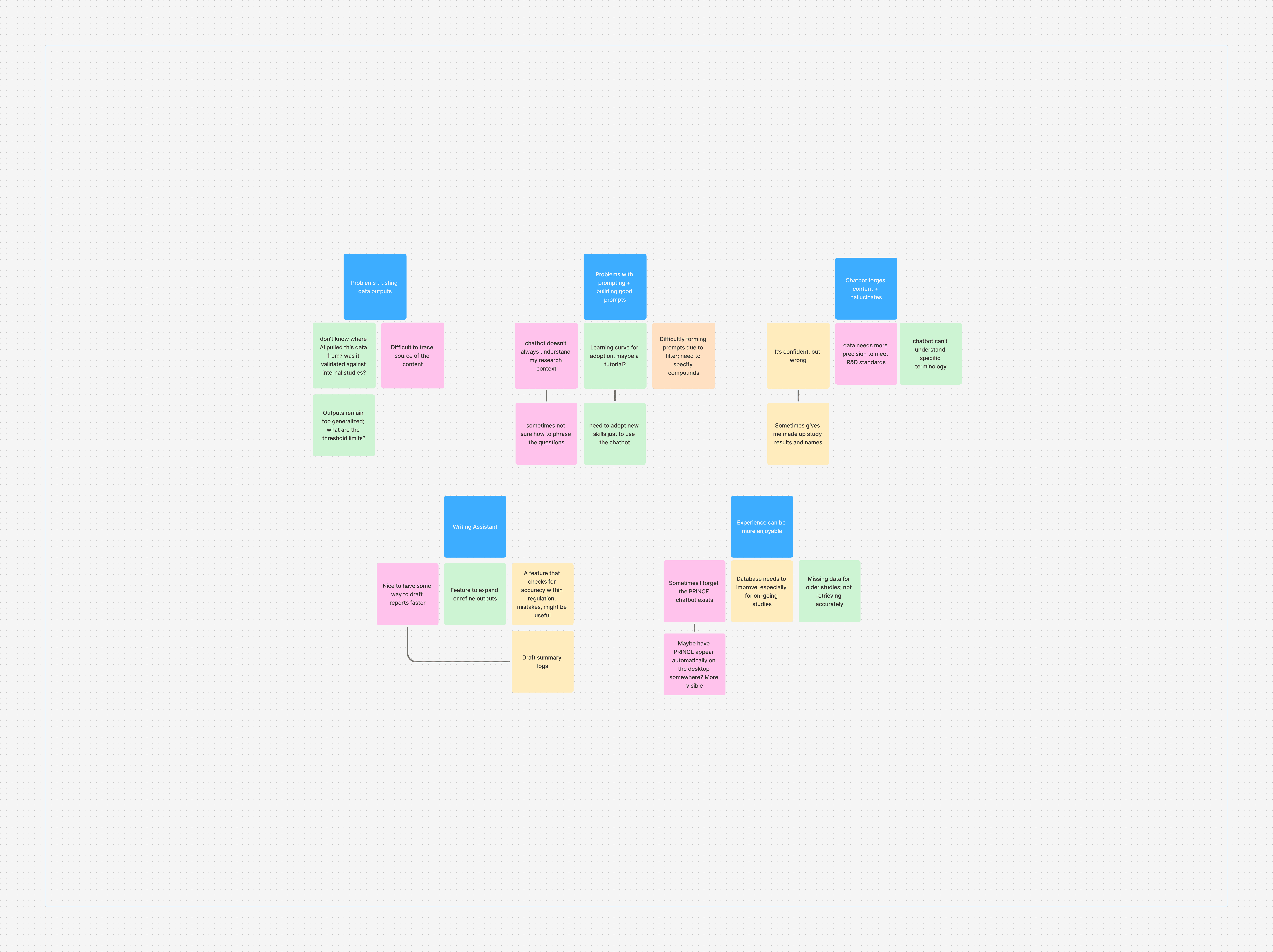 After uncovering key insights into how our users interact and leverage AI systems in their workflows, I translated the user findings into a affinity map. The goal was to identify common challenges and actionable use cases for possible features engineers could implement into the next product sprint.